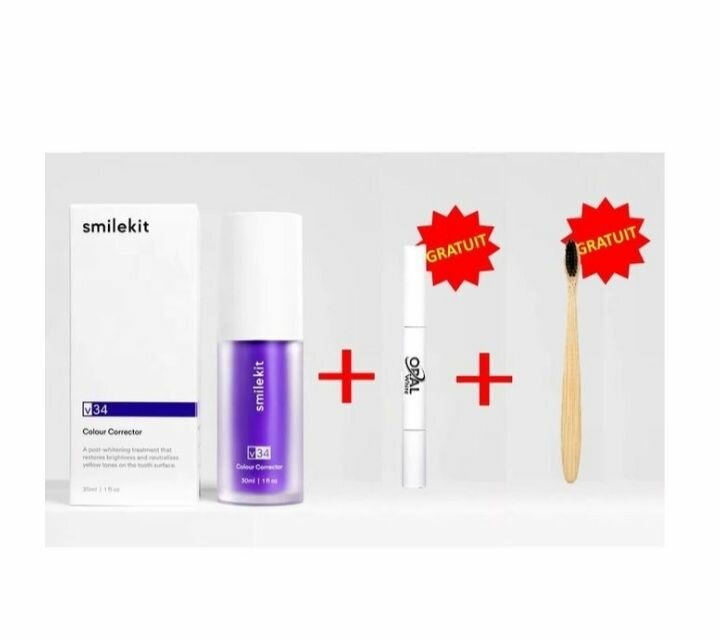 Corrigez la couleur de vos dents avec le kit Smilekit. Idéal pour une blancheur éclatante et une confiance retrouvée. Comprend un correcteur, un stylo blanchissant gratuit et une brosse en bambou. Convient à une utilisation quotidienne pour tous.