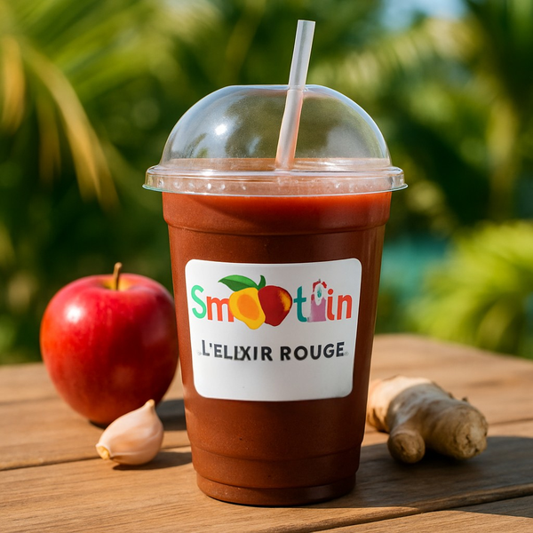 Le Bassam Booster, énergisant et immunisant, bon en convalescence, pour le sport ou la routine quotidienne Smoothie à base de banane, d'orange, d'ananas, et de gingembre.