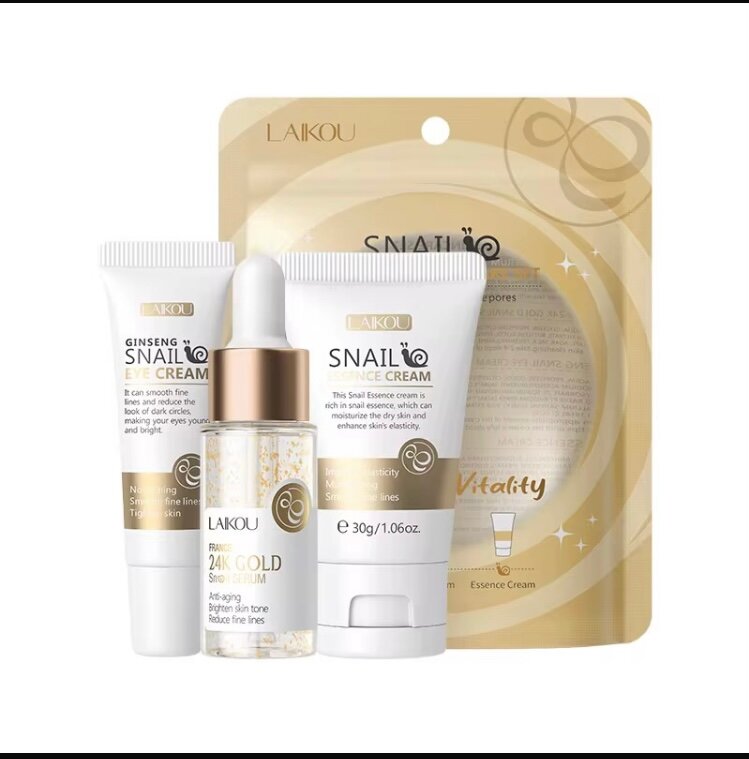 Découvrez le set de soin visage Laikou pour une peau éclatante et rajeunie. Combinant les bienfaits de la crème à la bave d'escargot, l'extrait de ginseng et le sérum à l'or 24K, ce kit offre une hydratation profonde, réduit les rides et illumine votre teint. Idéal pour tous types de peau, il est parfait pour une routine beauté quotidienne. Offrez-vous un soin de luxe chez vous !