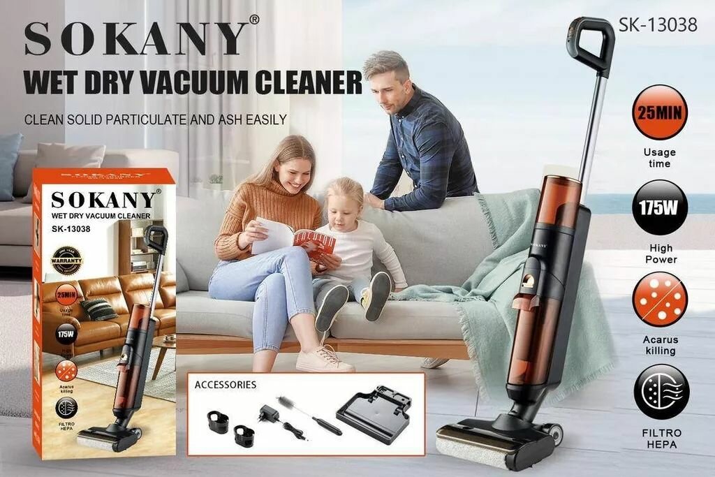 Аккумуляторный вертикальный пылесос SOKANY SK-13038 оранжевый для сухой и влажной уборки/ Вертикальный моющий пылесос Sokany это мощный пылесос, сочетающий в себе универсальность и производительность. Ручной пылесос швабра Sokany обеспечит быструю и качественную влажную уборку в любом помещении. Основные характеристики вертикального пылесоса тип уборки - влажная; высота 1.10 м; мощность 175 Вт; напряжение 220 В; щеточный двигатель HEPA-фильтр. Режим "быстрое всасывание" поможет избавиться от б