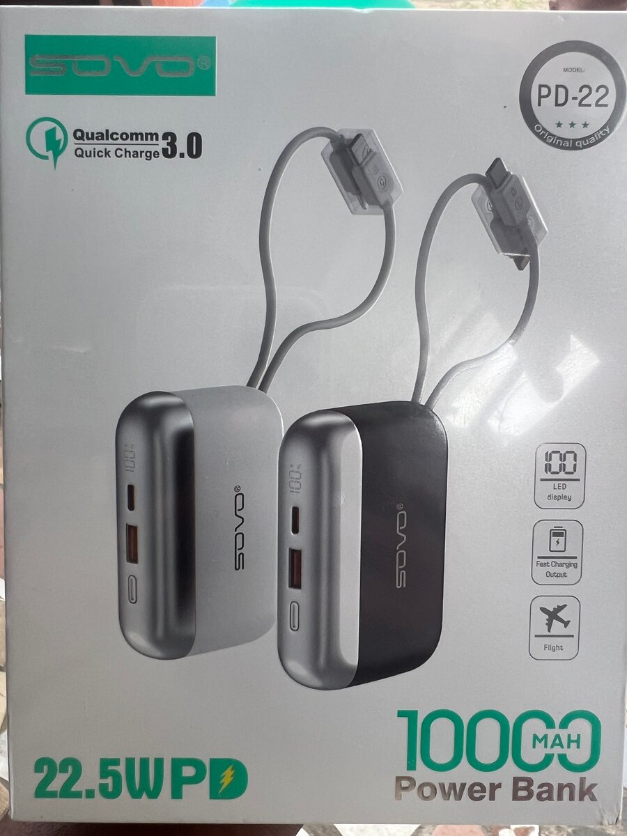 Stay connected on-the-go with SOVO's 10000mAh Power Bank featuring Quick Charge 3.0 technology. Perfect for charging multiple devices with USB and Type-C outputs. Compact and essential for travel or busy days, available in black and white.