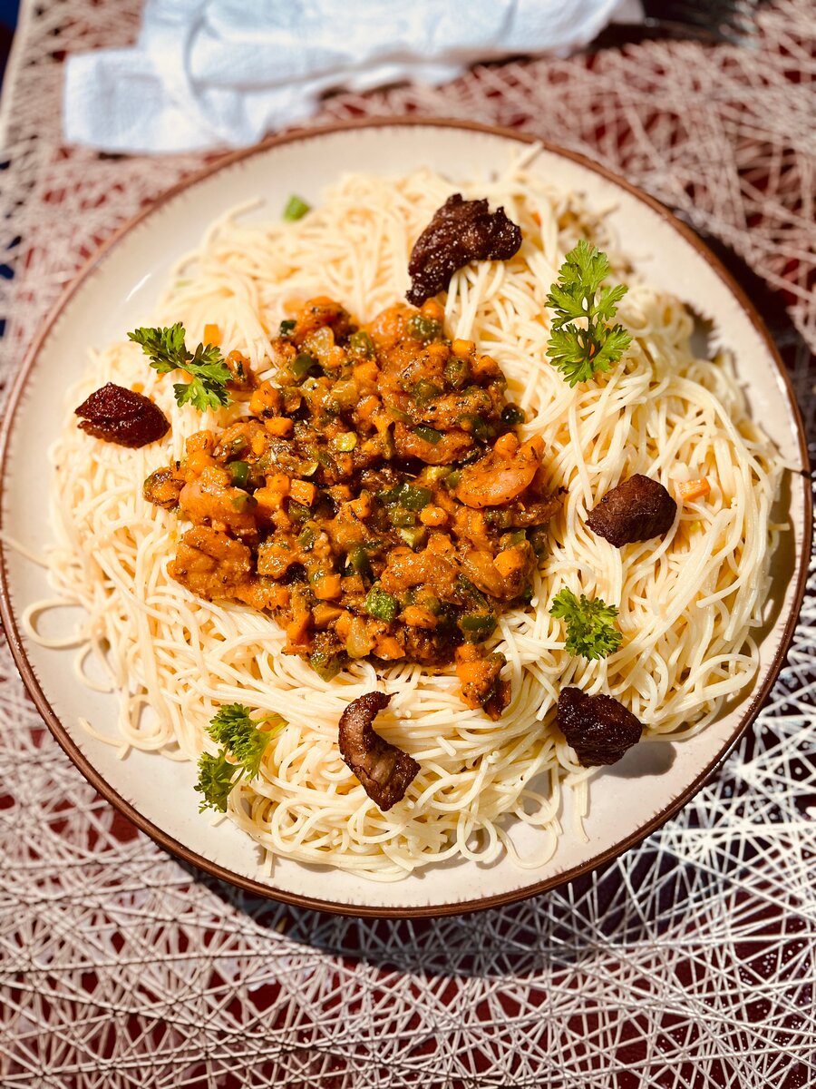 Découvrez notre plat gourmet de spaghetti al dente accompagné d'une sauce riche en légumes et herbes italiennes. Parfait pour un dîner savoureux et raffiné. Idéal pour les amateurs de cuisine italienne!