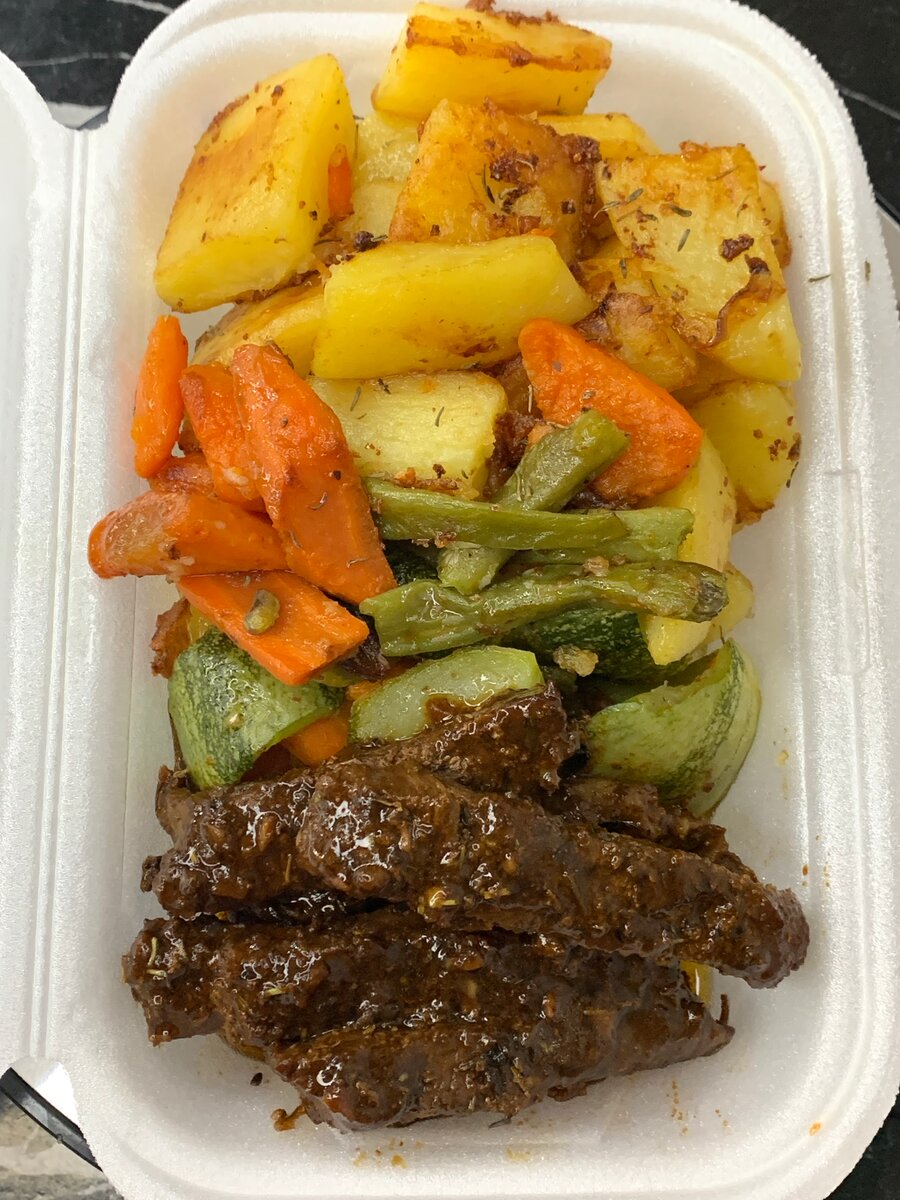 Découvrez ce délicieux plat cuisiné alliant légumes variés, généreuses pommes de terre sautées et rôtis de bœuf
