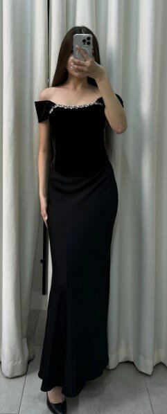 Красивое чёрное платье со спущенными плечиками