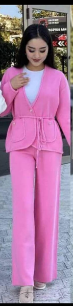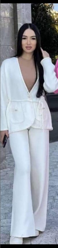 Асимметриялуу көйнөк жана галстук менен ак түстөгү аялдардын шым костюму