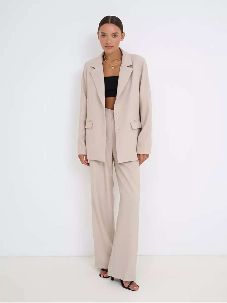 Костюм летний женский свободного кроя, состоящий из брюк палаццо и пиджака oversize - отлично впишется в ваш гардероб. Комплект двойка из льна с широкими штанами создаст удобный и комфортный наряд, который является трендом сезона.