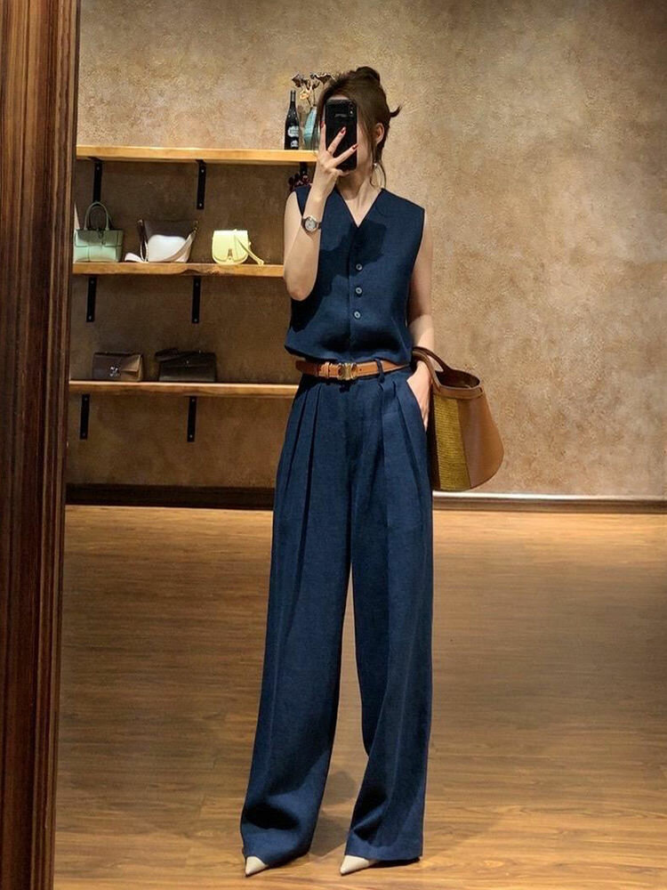 Двойка тёмно-синего цвета, жилет на пуговицах и широкие брюки