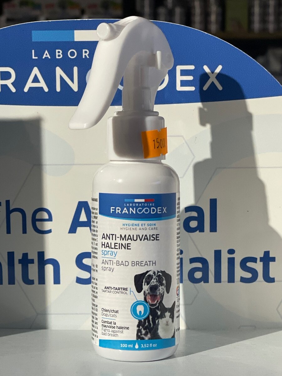 La formation progressive de la plaque dentaire entraîne un dépôt de tartre sur les dents, une mauvaise haleine ainsi quune gingivite qui peut être douloureuse. Le SPRAY ANTI MAUVAISE HALEINE FRANCODEX contient un extrait de grenade et de la vitamine C, pour limiter la formation de plaque dentaire, ainsi que des huiles de graines de persil et menthe poivrée pour lutter contre la mauvaise haleine de votre animal.