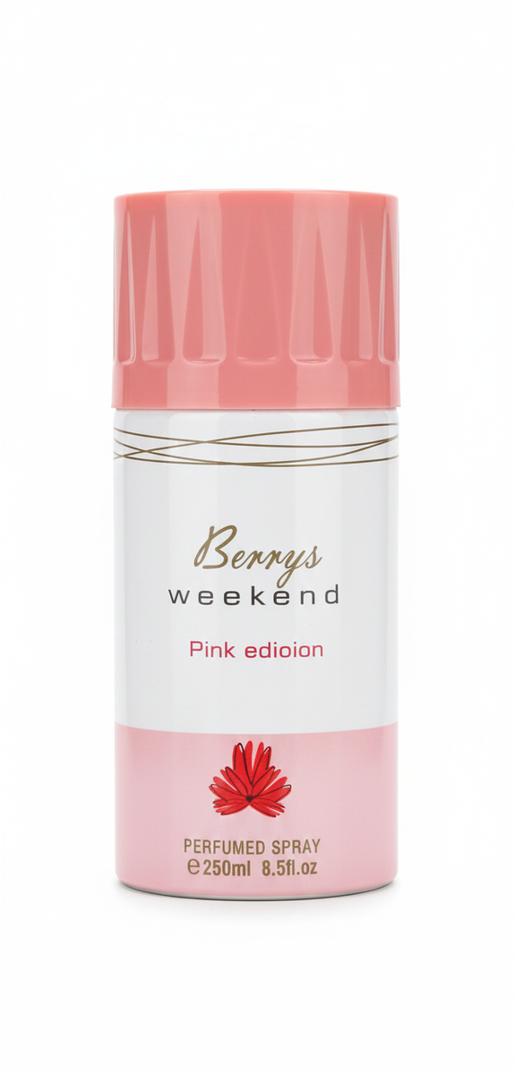 Découvrez le spray parfumé Berry's Weekend Pink Edition, une fragrance délicate pour sublimer votre quotidien. Avec ses notes florales uniques et sa fraîcheur, il vous garantit une sensation de bien-être tout au long de la journée. Parfait pour toutes occasions, ce parfum est votre allié pour un week-end chic et relaxant. Contenance de 250 ml, idéal pour une utilisation prolongée.