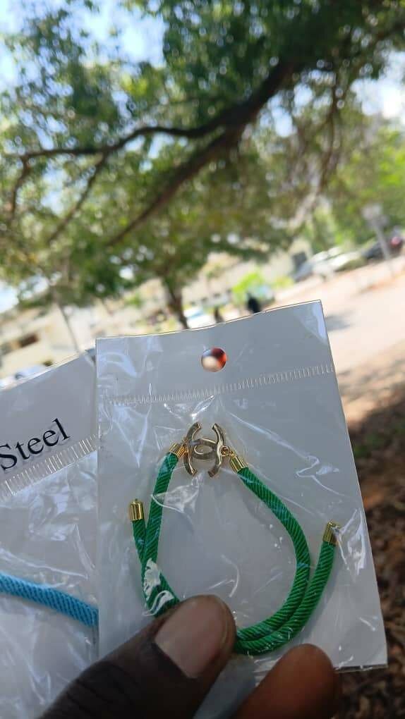 Elegant green rope bracelet with gold-tone accents and stainless steel clasp. Perfect for casual or formal wear, adding a touch of sophistication to any outfit.