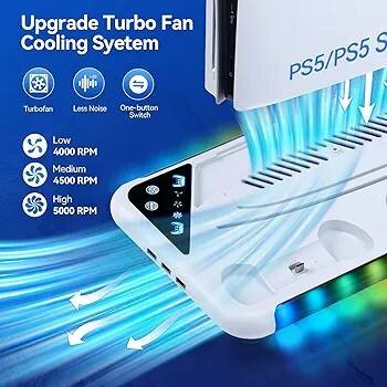 Optimisez votre espace de jeu avec cette station de charge RGB pour PS5. Avec un système de refroidissement turbo à trois vitesses, vos manettes restent performantes. Profitez d'une charge rapide en 3H pour deux contrôleurs et un support pour casque. Idéal pour les gamers.
