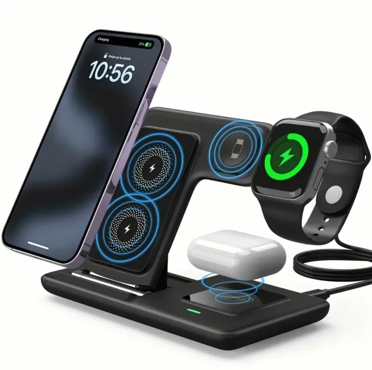 Station de charge sans fil pliable 3 en 1 Mingmai pour iPhone 15, 14, 13, 12, 11/Pro/Max/Mini/Plus, AirPods 3/2/Pro et Apple Watch 1-9 - Base de charge USB magnétique avec indicateur LED, noir, station de charge pour iPhone | Station de charge moderne | Plateau de charge élégant