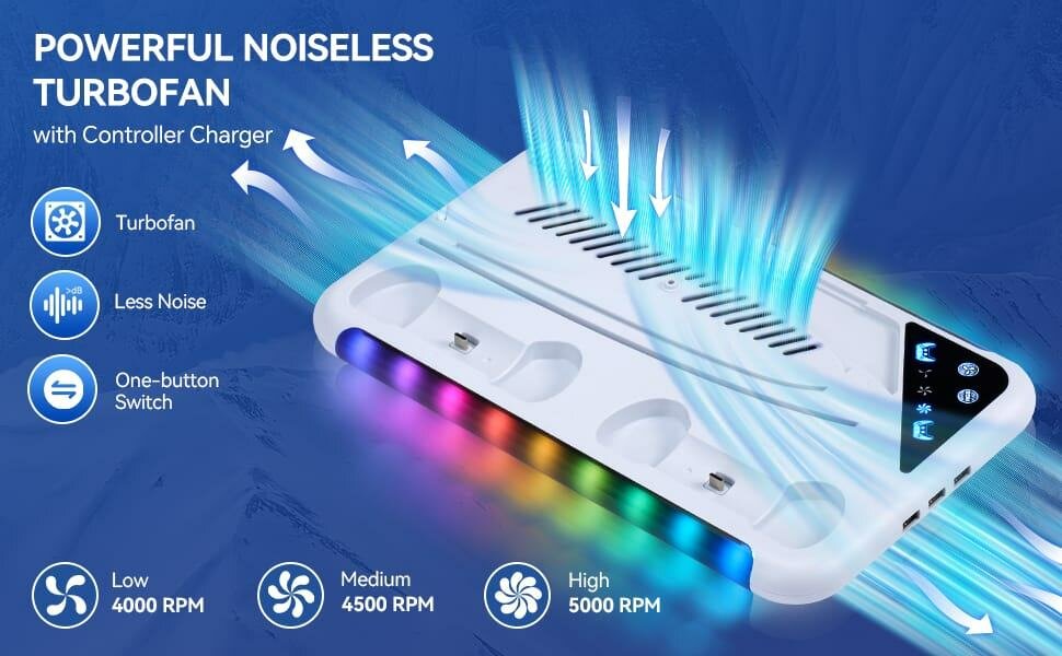 Optimisez vos sessions de jeu avec notre station de refroidissement RGB pour PS5, conçue pour refroidir efficacement votre console tout en rechargeant vos manettes. Profitez de sa LED colorée attrayante et de son ventilateur turbo silencieux à trois vitesses réglables. Idéale pour les joueurs passionnés cherchant performance et style.
