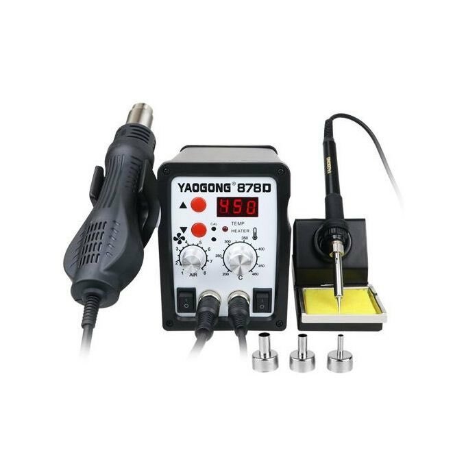 Station de soudures Yaogong 878D, idéale pour les réparations électroniques précises. Inclut fer à souder et souffleur d'air chaud pour une utilisation polyvalente. Parfait pour amateurs et professionnels de l'électronique. Température réglable pour un contrôle optimal.