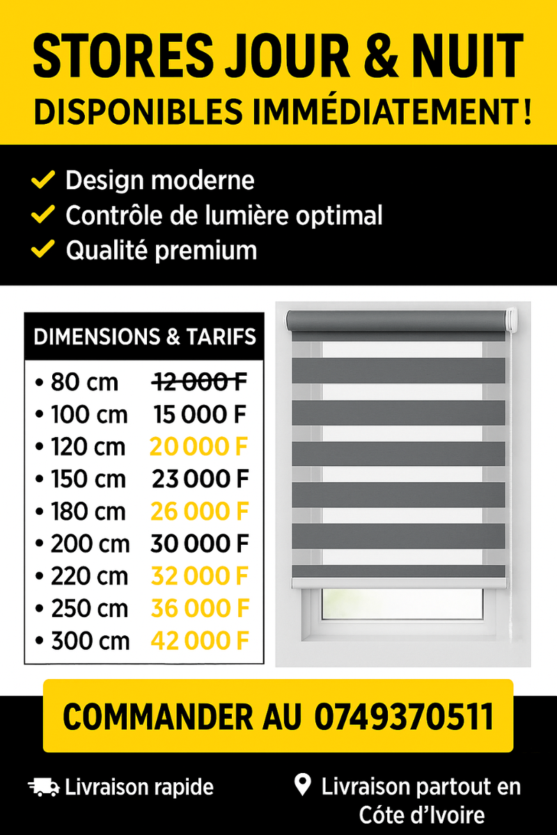 Optimisez votre confort avec nos stores jour et nuit modernes. Contrôle de lumière parfait, design élégant et qualité premium pour toutes décorations intérieures. Idéal pour salons, chambres et bureaux. Disponible en plusieurs tailles pour s'adapter à vos besoins. Livraison rapide en Côte d'Ivoire!