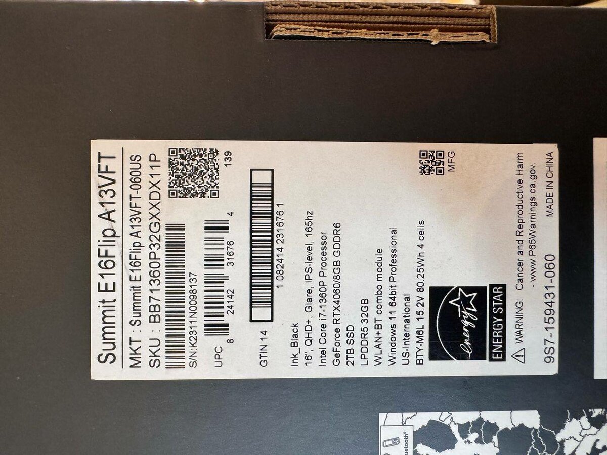 Ink Black 16", QHD+, Glare, IPS-level, 165hz Intel Core i7-1360P Processor GeForce RTX4060/8GB GDDR6 2TB SSD LPDDR5 32GB WLAN+BT combo module Windows 11 64bit Professional US-International BTY-MOL 15.2V 80.25Wh 4 cells