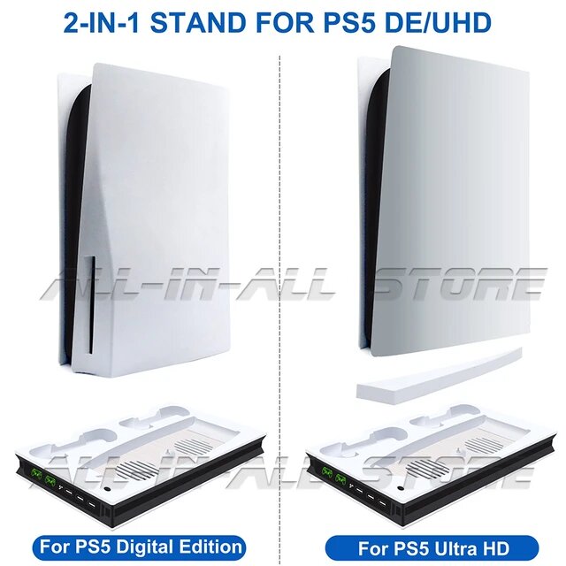 Support 2-en-1 pour PS5 DE/UHD avec refroidissement et rangement pour manettes. Compatible avec les éditions PS5 Digital et Ultra HD.