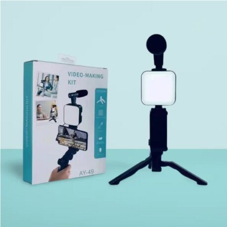 Kit professionnel pour créateurs de contenu avec trépied, éclairage LED et microphone externe. Idéal pour les prises de vue sur smartphone, les vidéos en ligne et les streams. Contenu : trépied flexible, lumière LED, microphone et accessoires.