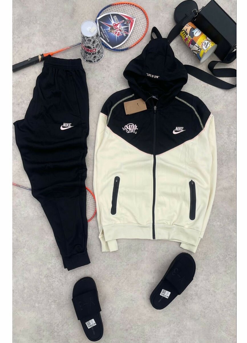 Ce survêtement élégant avec veste à capuche noir et blanc et pantalon confortable est parfait pour le sport ou les loisirs. Idéal pour le tennis ou les activités de plein air, il offre confort et style. Conçu pour s'adapter à toutes les tailles avec détails soignés et logo distinctif.