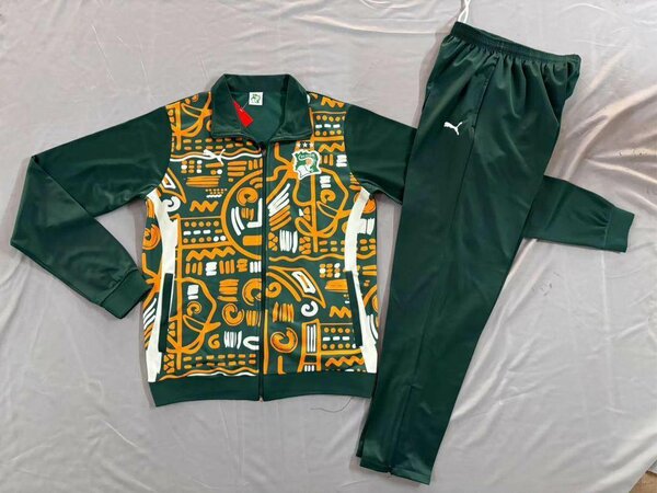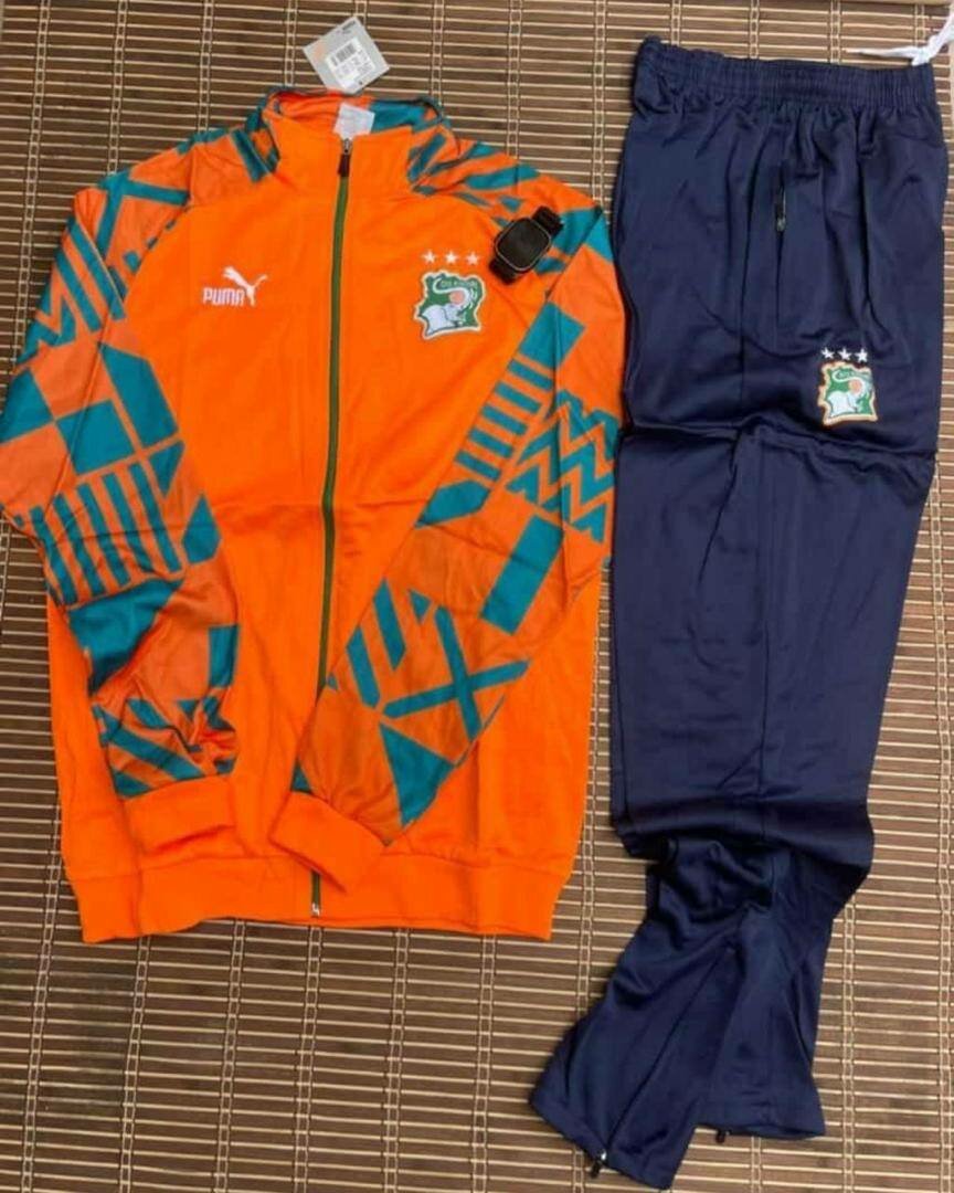 Survêtement de sport officiel de l'équipe de football de la Côte d'Ivoire, conçu par Puma. Idéal pour les fans et les sportifs, offrant confort et style moderne. Parfait pour l'entraînement et les sorties décontractées.
