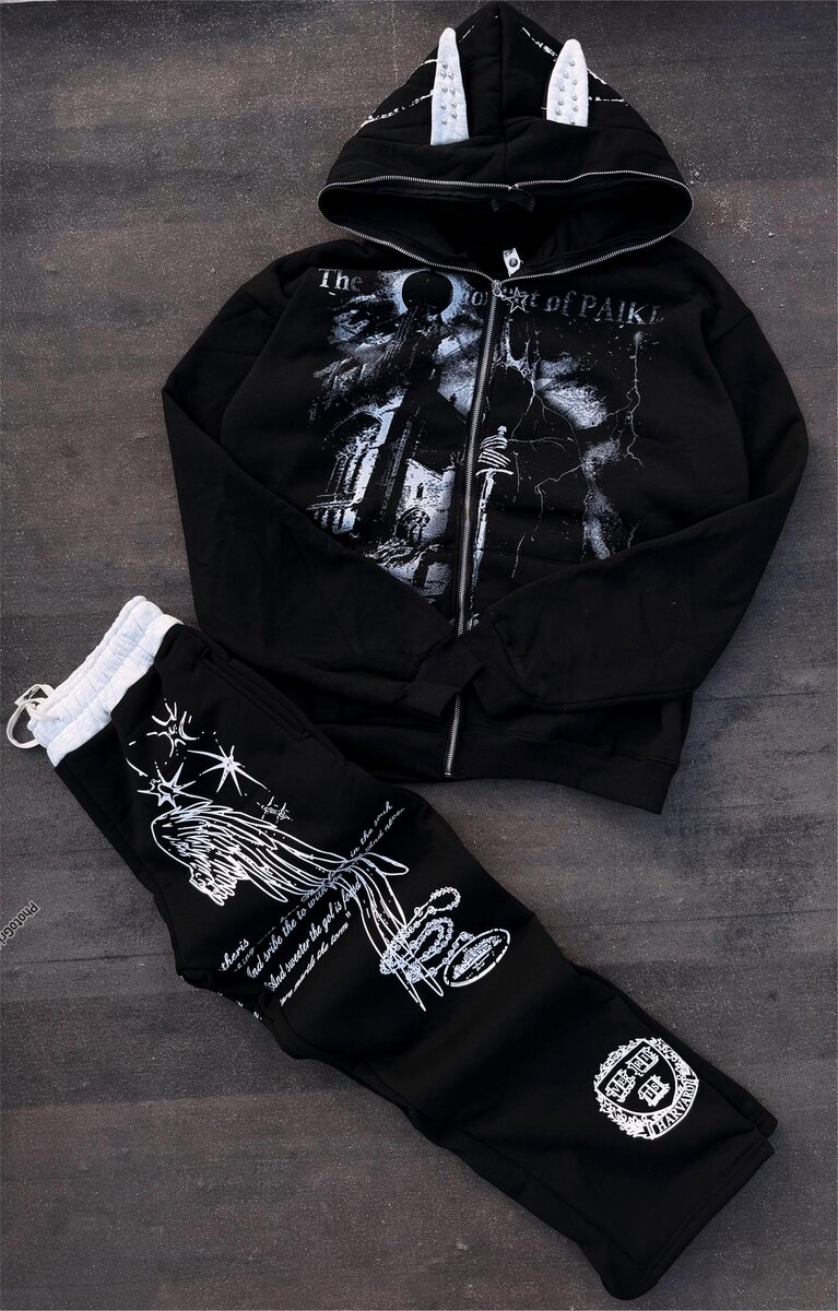 Adoptez ce survêtement gothique unique et stylé. Parfait pour un look audacieux, il offre confort et originalité grâce à ses motifs artistiques et sa capuche à cornes. Idéal pour les amateurs de mode alternative.