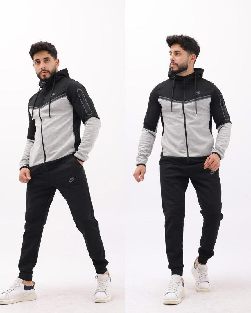 Ensemble survêtement moderne pour homme, idéal pour le sport ou un style décontracté. Ce vêtement allie confort et style avec sa coupe ajustée et ses matériaux de qualité.