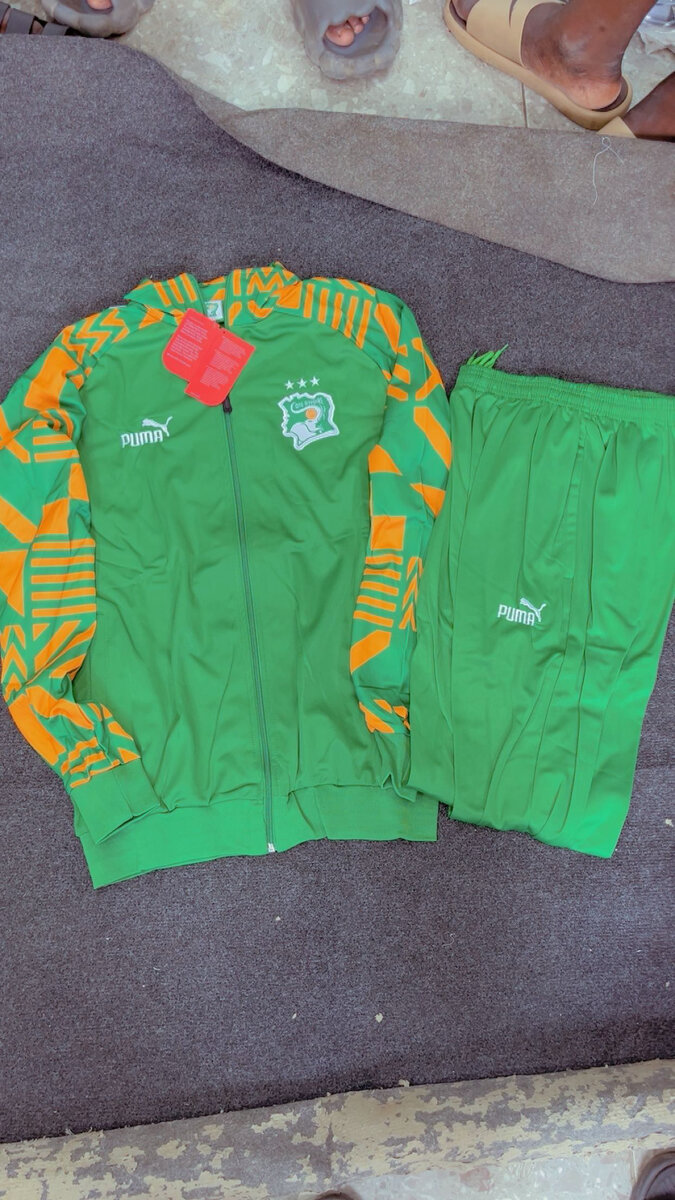 Ensemble prêt-à-porter Puma en vert avec motifs orange, idéal pour le sport et les loisirs. Confortable et stylé, c'est le choix parfait pour un look sportif et décontracté.