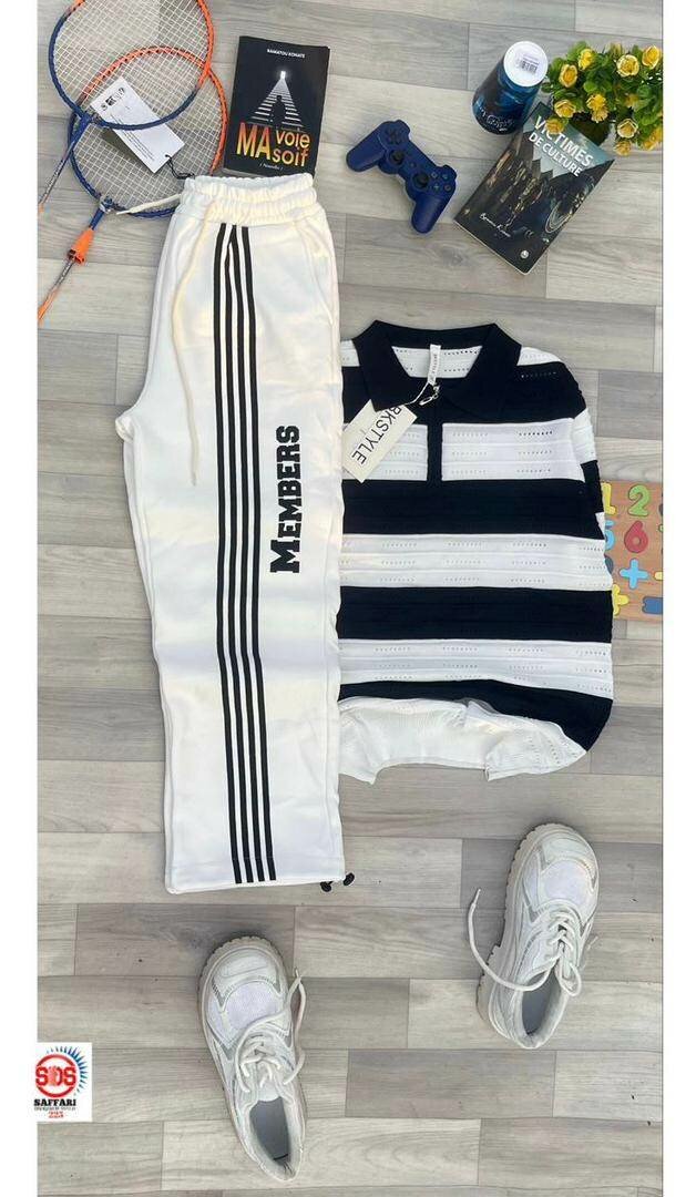 Optez pour ce survêtement chic et confortable, composé d'un pull rayé et d'un pantalon blanc avec rayures latérales. Parfait pour le sport ou les sorties décontractées, avec un design moderne qui attire le regard. Idéal pour une allure tendance.
