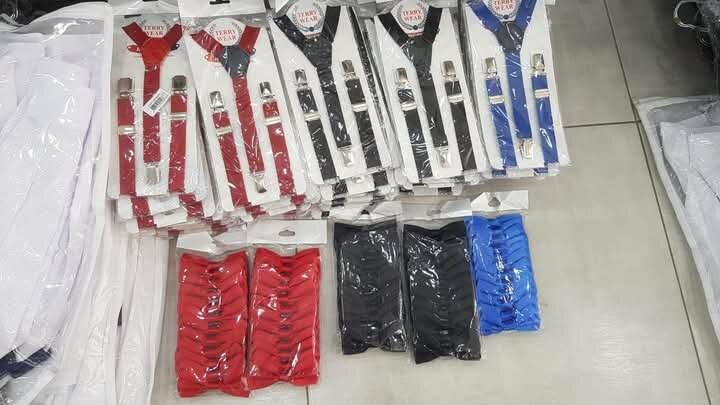 Quality suspenders with bow tie. Color: black, blue, red , off white available. Age 1-13 yrs