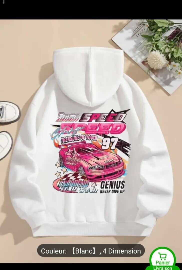 Sweat à capuche blanc avec un design vibrant représentant une voiture de course. Idéal pour les fans de vitesse et de style streetwear. Confortable et tendance.