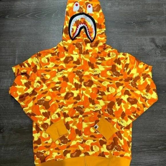 Sweat à capuche camouflage orange avec design requin. Parfait pour les fans de mode streetwear et de la marque Bape.
