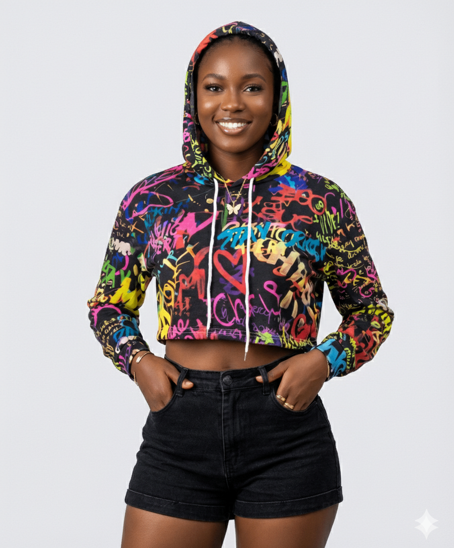 Découvrez ce sweat à capuche tendance avec un imprimé graffiti coloré. Conçu pour les femmes qui aiment le style urbain et décontracté. Idéal pour un look tendance et confortable.