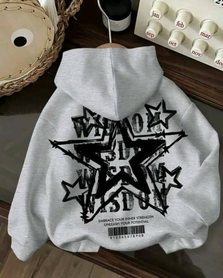 Sweat à capuche gris avec un design graphique noir et des étoiles. Conçu pour le confort et le style, parfait pour les looks décontractés. Encolure haute pour une protection maximale.