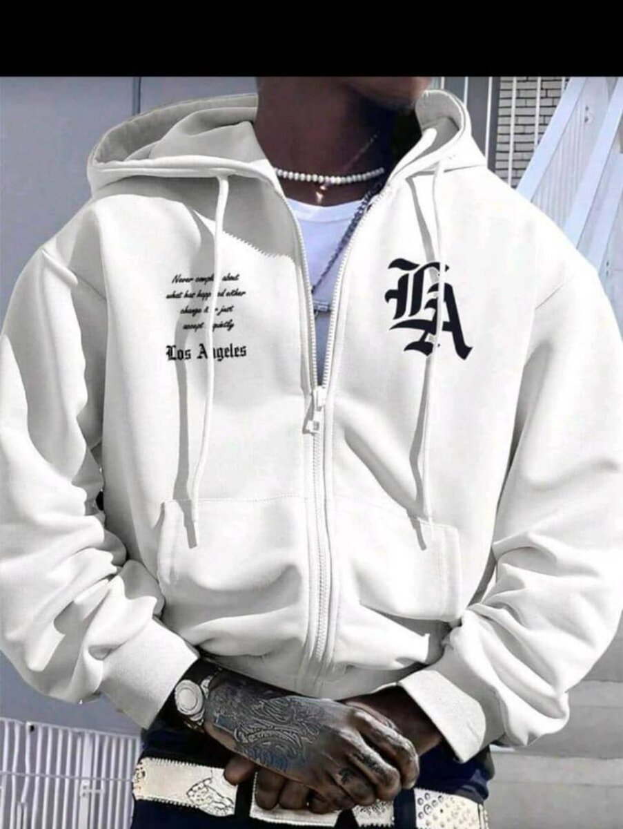 Sweat à capuche pour homme de couleur blanche avec fermeture éclair et impression LA. Confortable et élégant, parfait pour un look décontracté urbain.