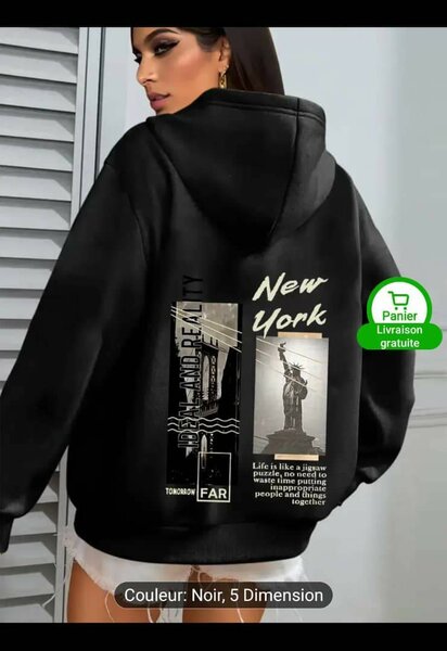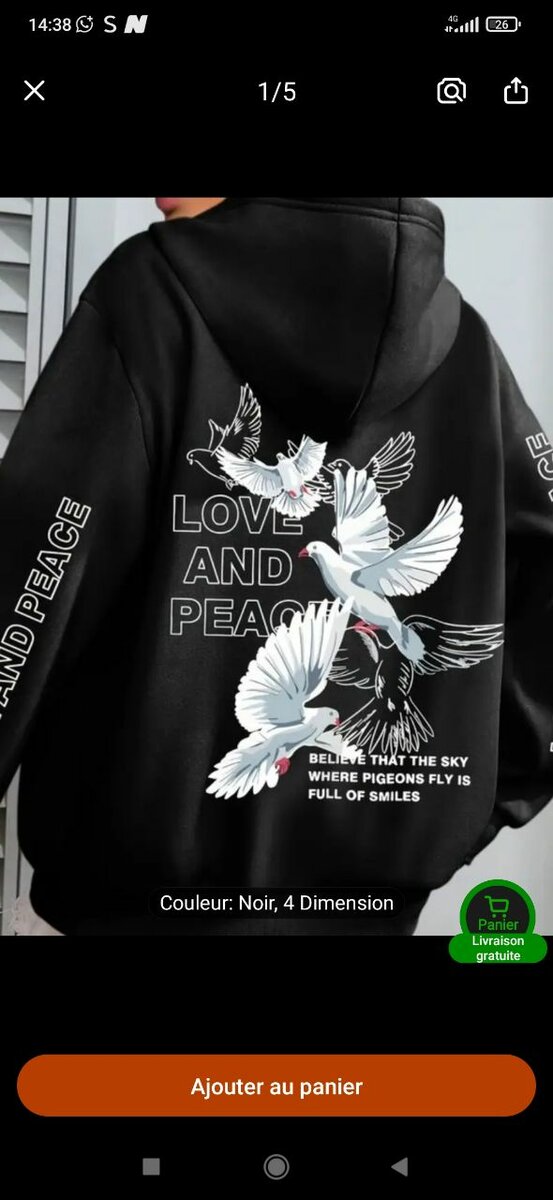 Ce sweat à capuche noir arbore un design unique avec des motifs de pigeons et des messages inspirants de paix et d'amour. Parfait pour un look décontracté.