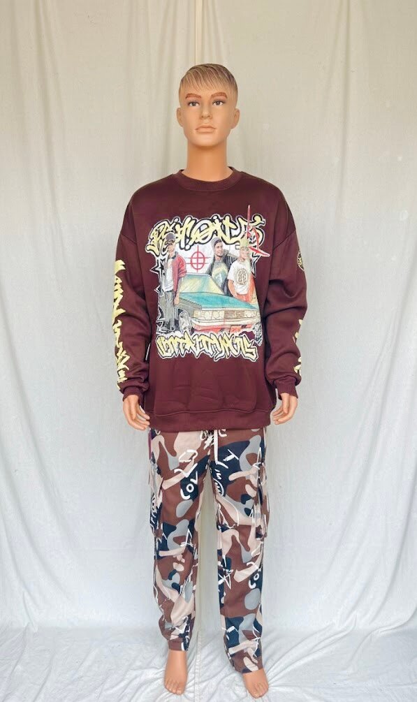 Sweat marron avec un imprimé graphique sur le devant et les manches. Conçu pour un style décontracté et confortable. Idéal pour les hommes qui aiment la mode streetwear.