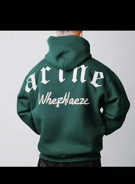 Sweat à capuche vert style streetwear avec texte 'Arine Whephlaeze' au dos. Confortable et parfait pour un look décontracté urbain.