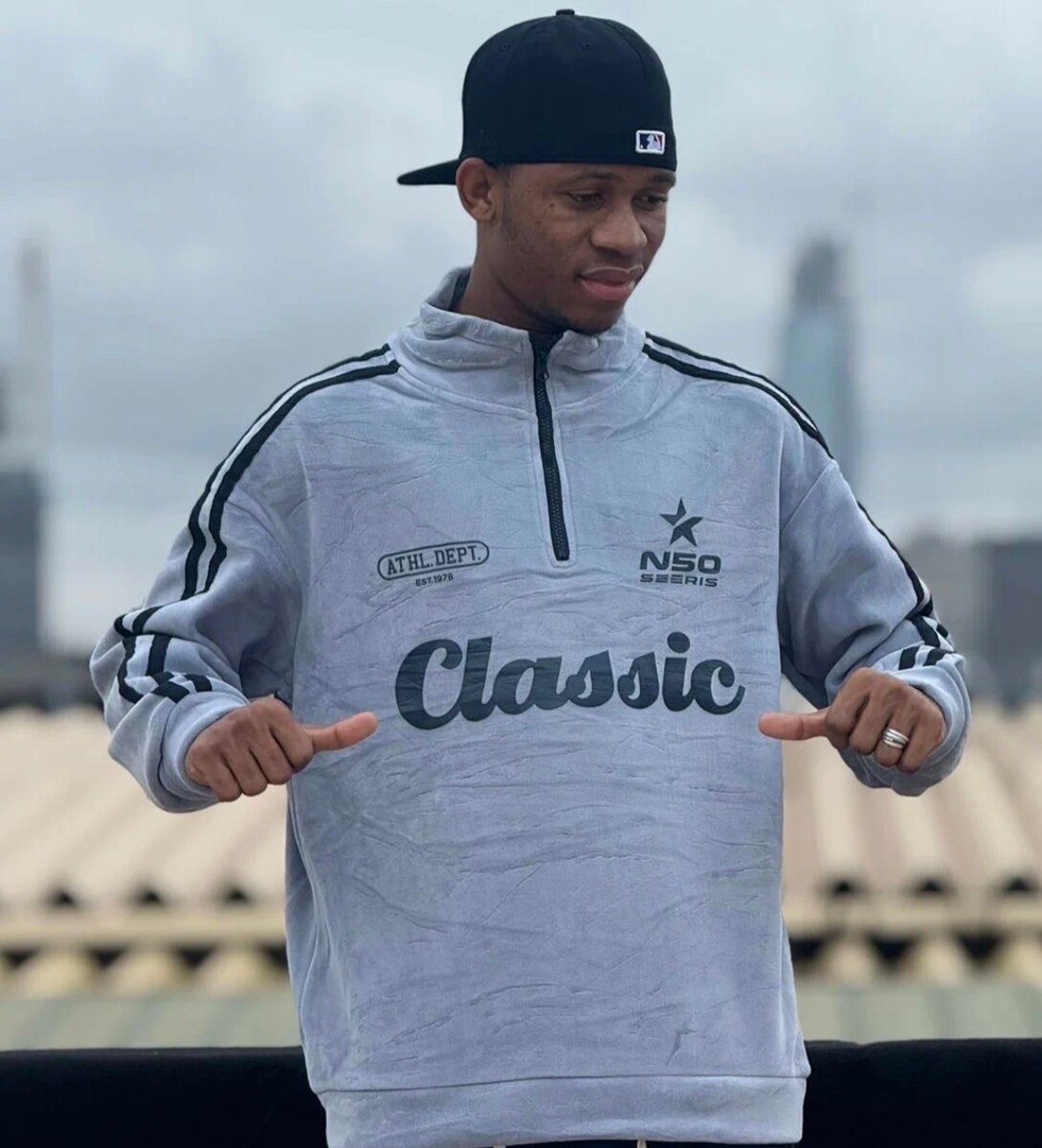Sweat-shirt homme gris de style Classic avec logos NSO et ATHLE Dept. Conçu pour un look urbain et décontracté, idéal pour les amateurs de mode streetwear.
