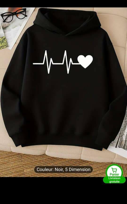 Découvrez ce sweat-shirt noir à capuche avec un élégant motif de battement de cœur blanc. Idéal pour un look décontracté et tendance, sa matière douce assure un confort optimal. Parfait pour les sorties ou les moments de détente à la maison. Un choix parfait pour exprimer votre style avec cœur !