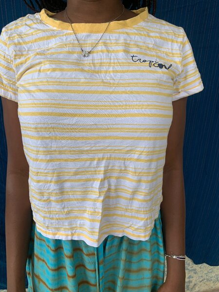 T-shirt à manches courtes en coton doux avec rayures vertes et blanches. Confortable et tendance, parfait pour un look décontracté. Idéal pour le quotidien ou les sorties estivales. Disponible en plusieurs tailles.