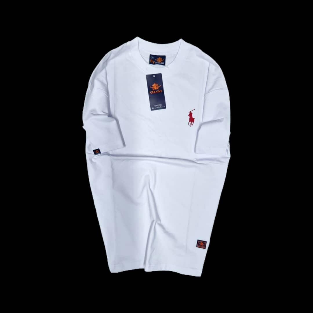 T-shirt blanc classique avec logo rouge. Confortable et élégant, idéal pour un usage quotidien. Parfait pour hommes recherchant style et simplicité.