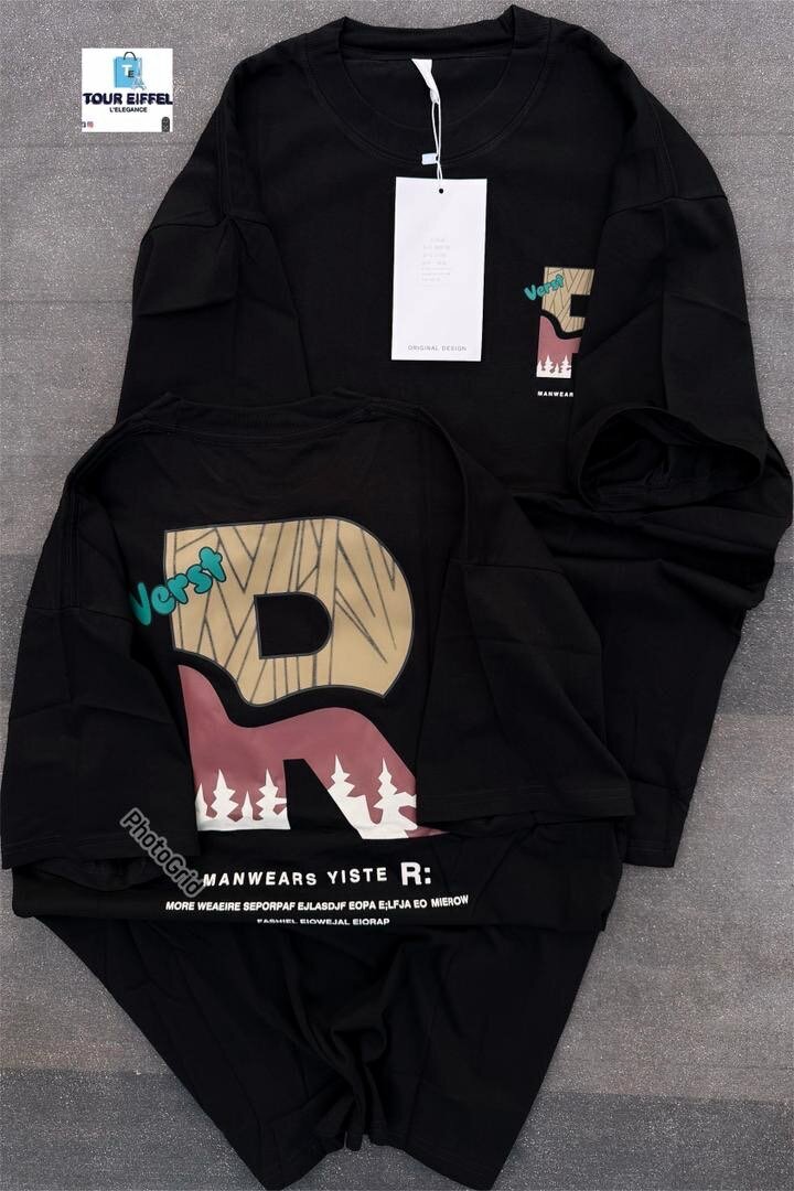 T-shirt noir avec design unique d'une lettre R sur fond de forêts, idéal pour un look moderne et décontracté. Fabriqué en coton doux pour un confort optimal. Parfait pour des sorties urbaines ou des moments de détente.