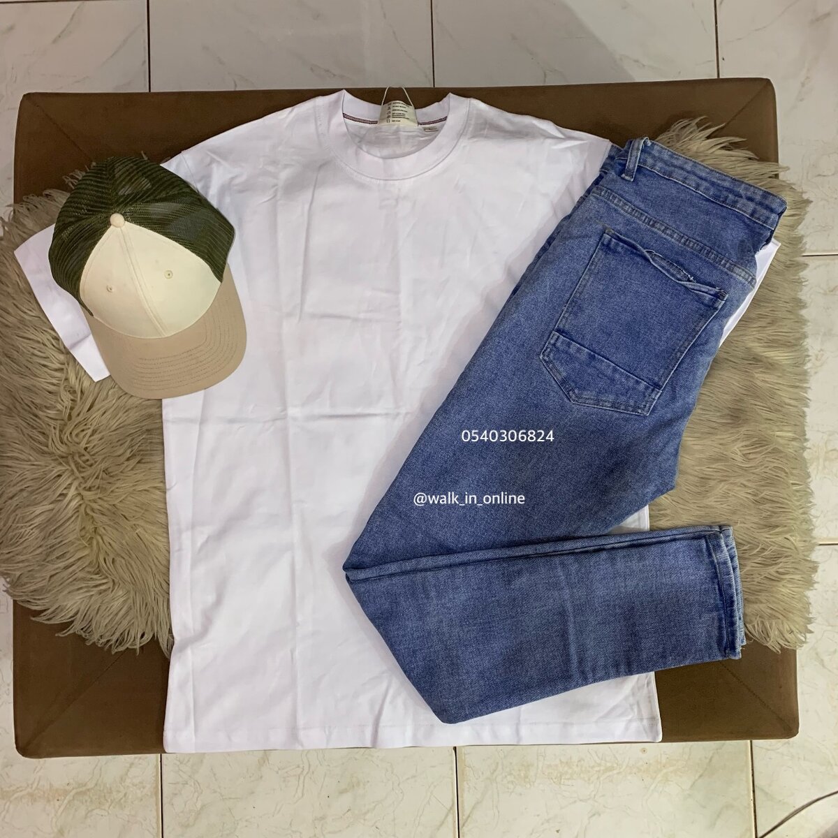 T-shirt, jeans trouser and a cap