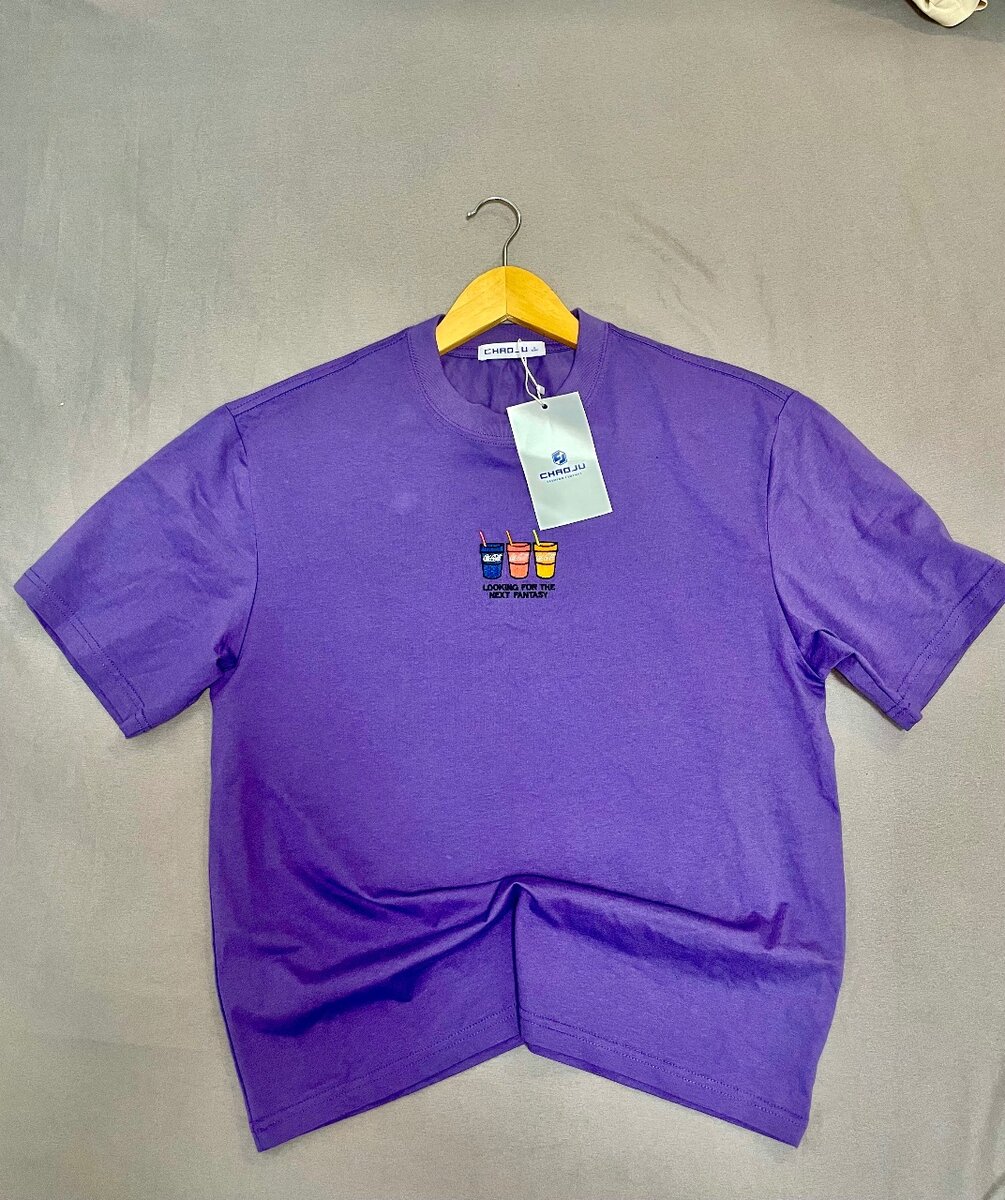 Ajoutez une touche de style avec ce t-shirt violet en coton doux. Son design unique présente une broderie colorée avec trois boissons et linscription Looking for the Next Fantasy. Sa coupe unisexe légèrement ample offre un confort optimal pour un look casual et tendance.