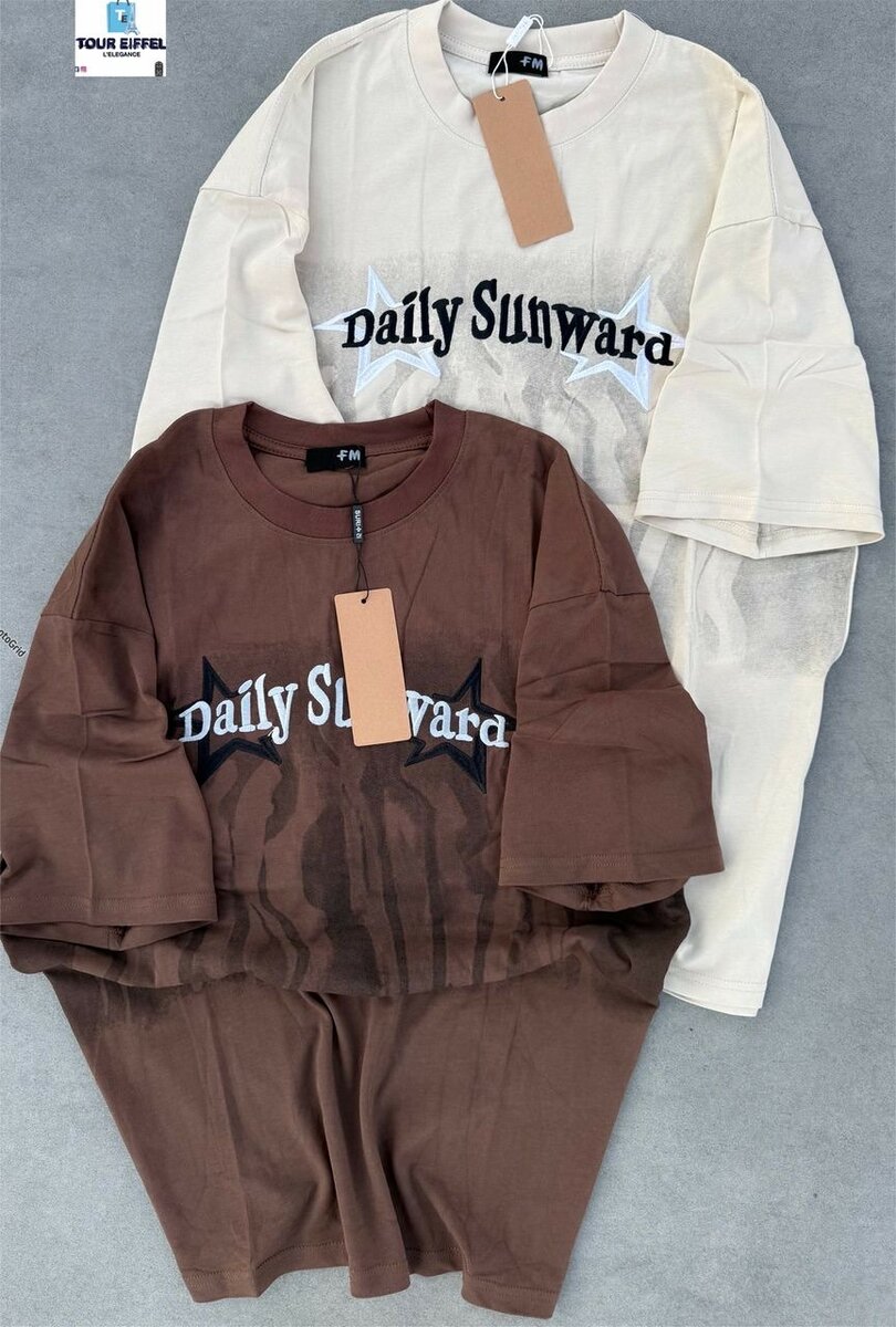 T-shirts en coton doux pour un confort ultime. Disponibles en beige et marron avec un design moderne "Daily Sunward". Parfaits pour une tenue décontractée quotidienne, ces t-shirts sont polyvalents et stylés.
