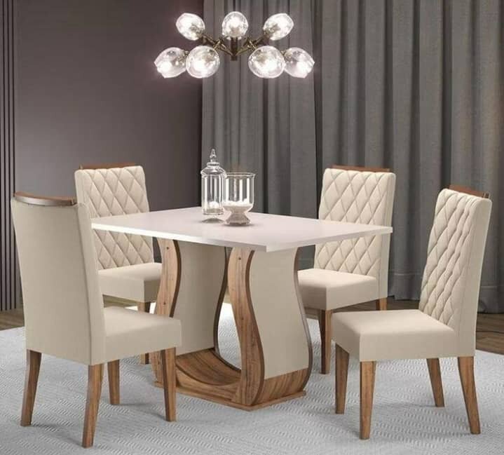 Élégante table à manger design avec chaises capitonnées. Faite de bois et verre, idéale pour les repas en famille ou entre amis.