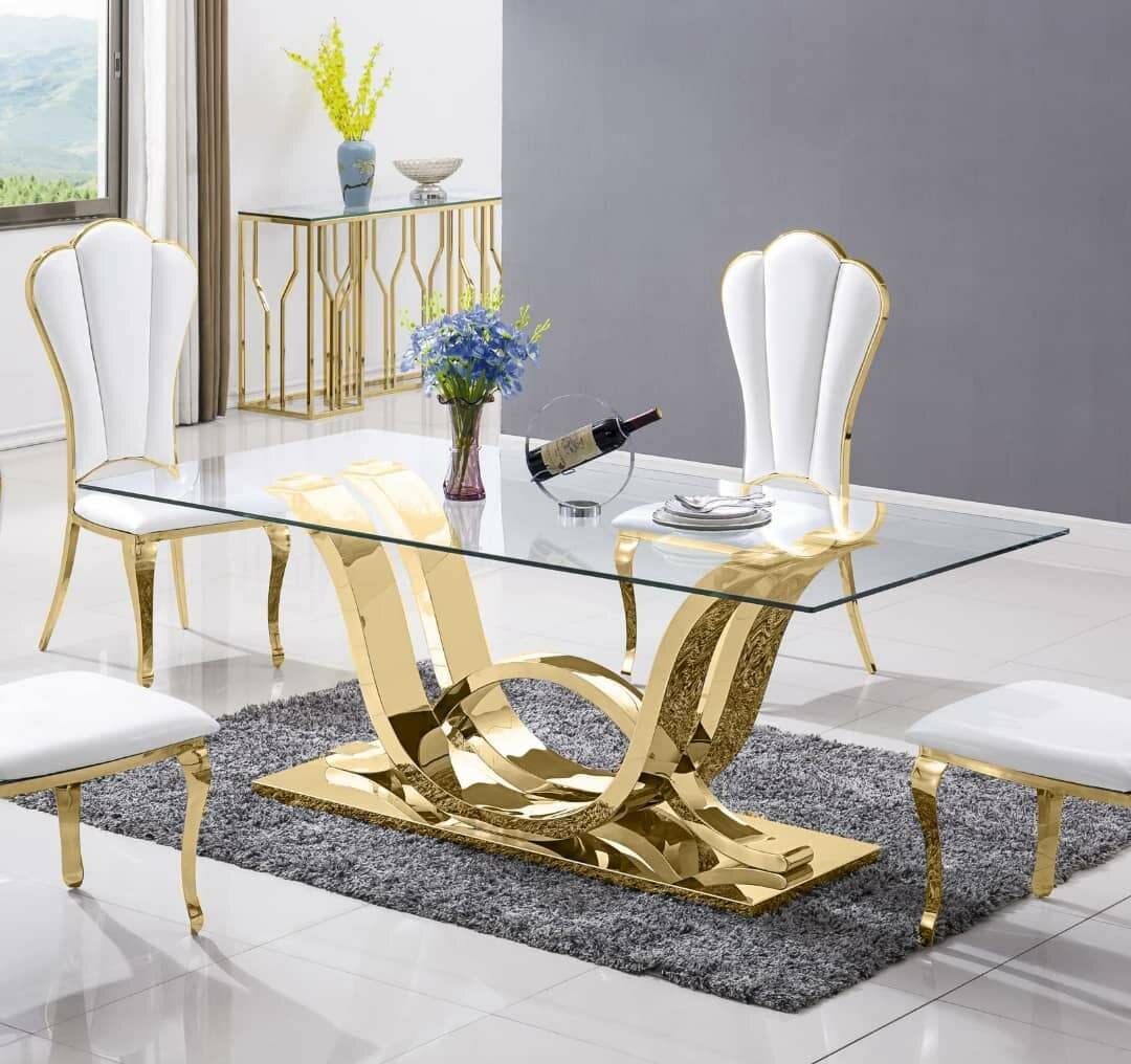 Découvrez cette table à manger en verre avec une base en métal de haute qualité. Son design moderne et élégant s'intègre parfaitement dans une salle à manger contemporaine. La surface en verre transparent permet une facilité d'entretien et offre une vue imprenable sur la base métallique sculpturale. Idéal pour les réceptions ou les repas en famille.