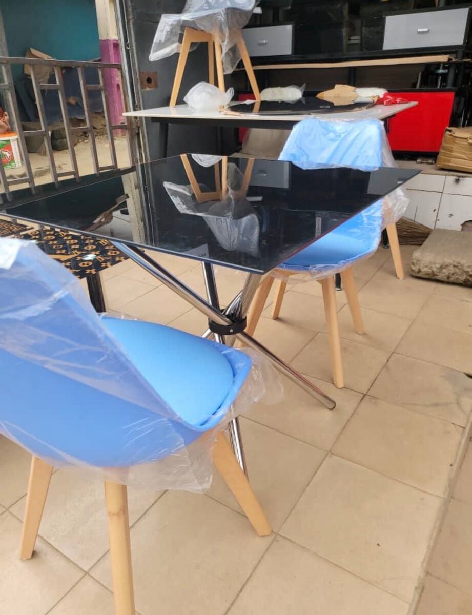 Table à manger moderne avec plateau en verre noir et pieds en métal chromé. Parfaite pour une salle à manger chic. Complétez votre espace avec style et élégance. Idéale pour les repas quotidiens ou les occasions spéciales, elle est à la fois pratique et esthétique.
