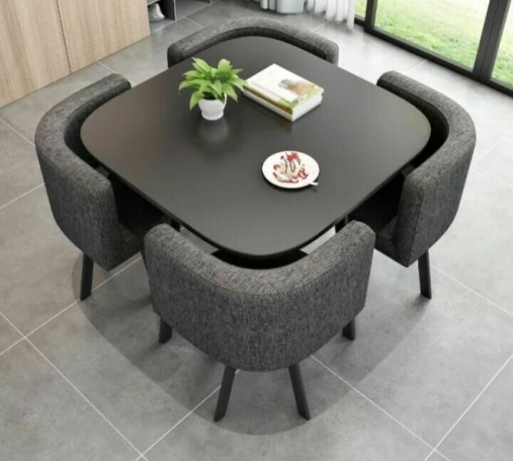 Découvrez notre table à manger moderne noire avec ses chaises grises élégantes. Parfaite pour les repas en famille ou entre amis, cette table est conçue pour offrir un espace confortable et design. Fabriquée avec des matériaux de qualité, elle est robuste et facile à entretenir.