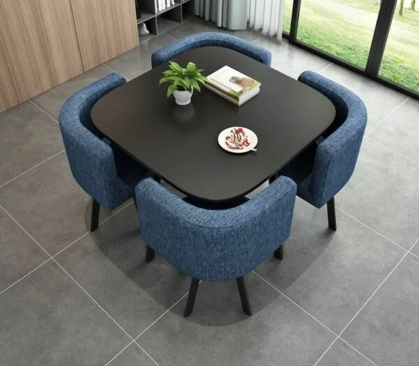 Ensemble de salle à manger élégant comprenant une table noire et 6 chaises grises rembourrées. Idéal pour les repas en famille ou entre amis. Conception moderne et robuste.